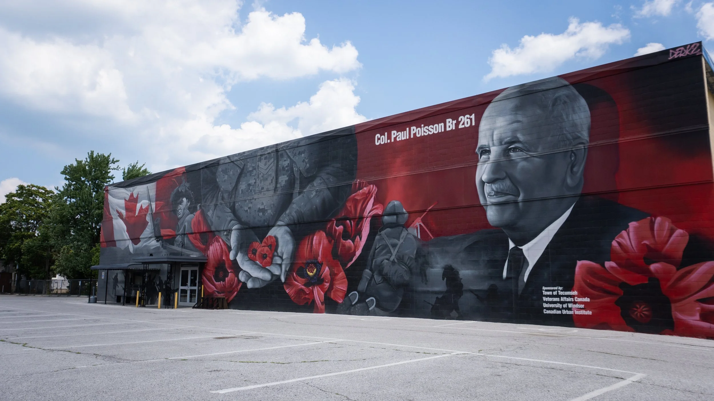 In 2022, to mark Tecumseh’s 100th anniversary, our building became home to a breathtaking mural—a 127-foot-wide tribute painted by Windsor artist David Derkatz (DERKZ). This powerful artwork features scenes from Canadian military history, the iconic poppy, and a portrait of Colonel Poisson himself.