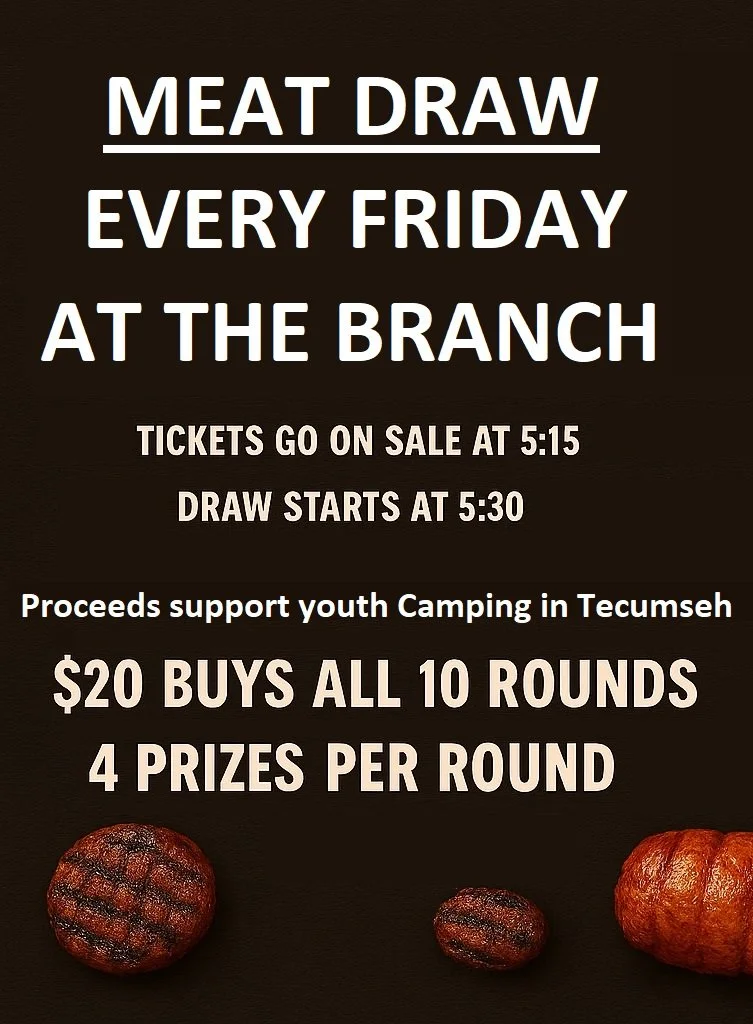 Everyone welcome. Kitchen is open and serving Fish and Chicken dinners. Come in for dinner, and win some great meat prizes.